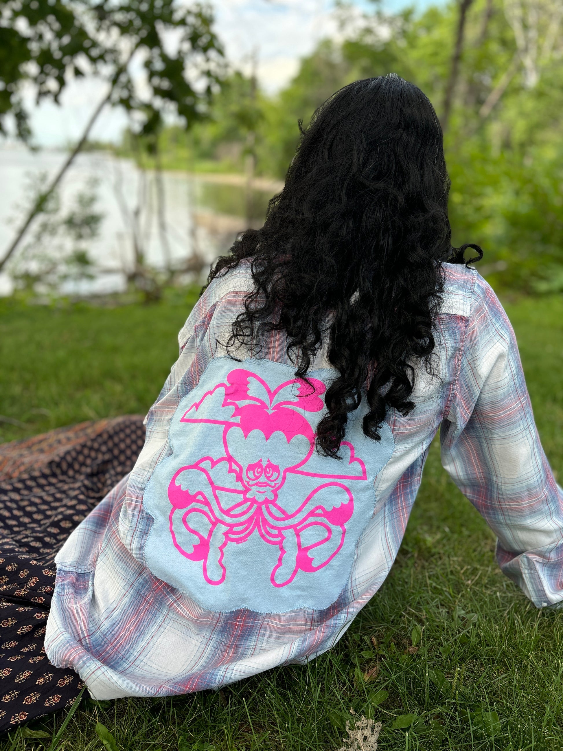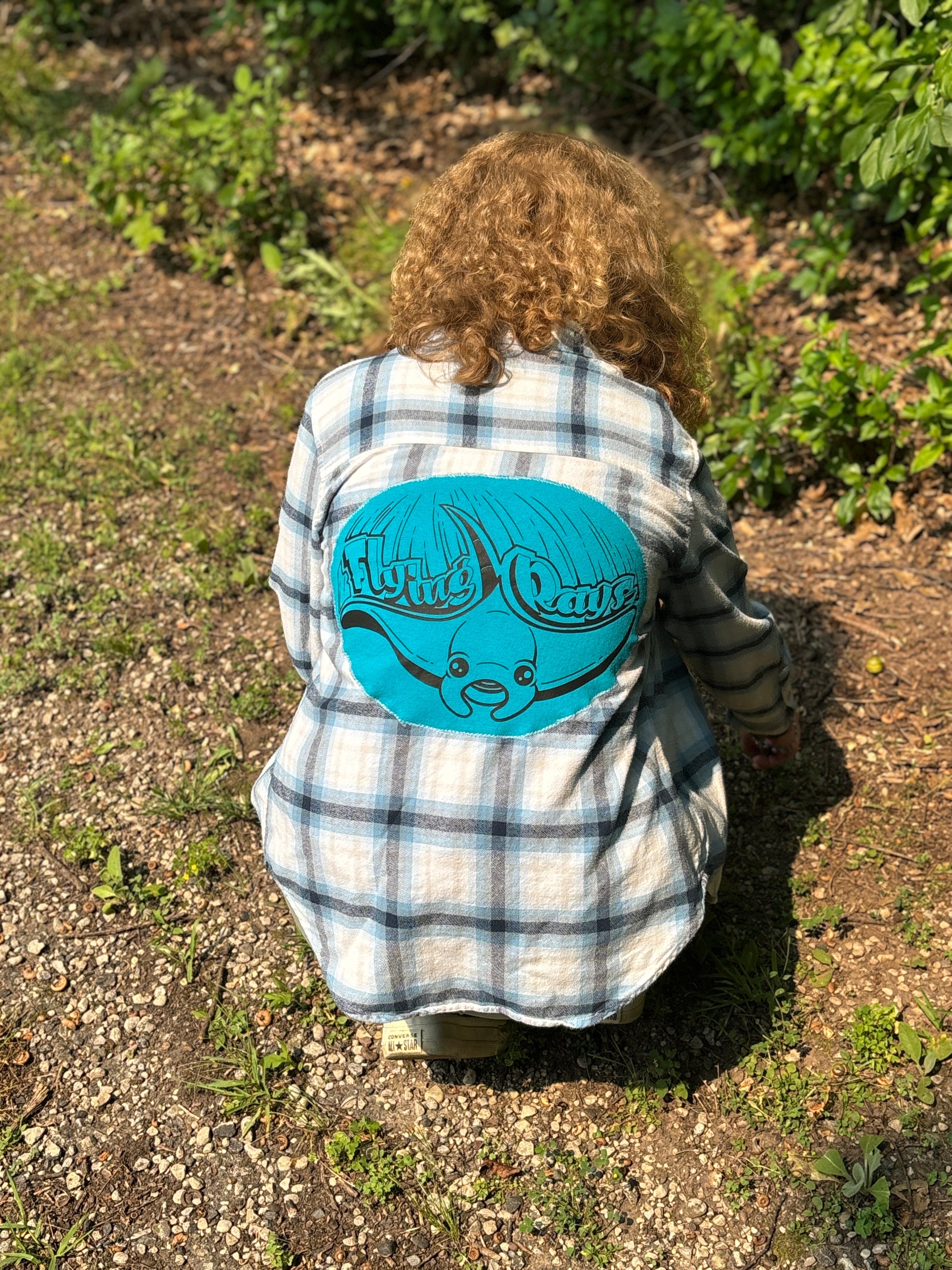 Flying Ray - t-shirt art by Sadie Kern (popgunflo). The base flannel is a women’s small, but the exact measurements are as follows: chest - 21.5”, length - 27”, shoulder - 5.5”, sleeve - 23”.