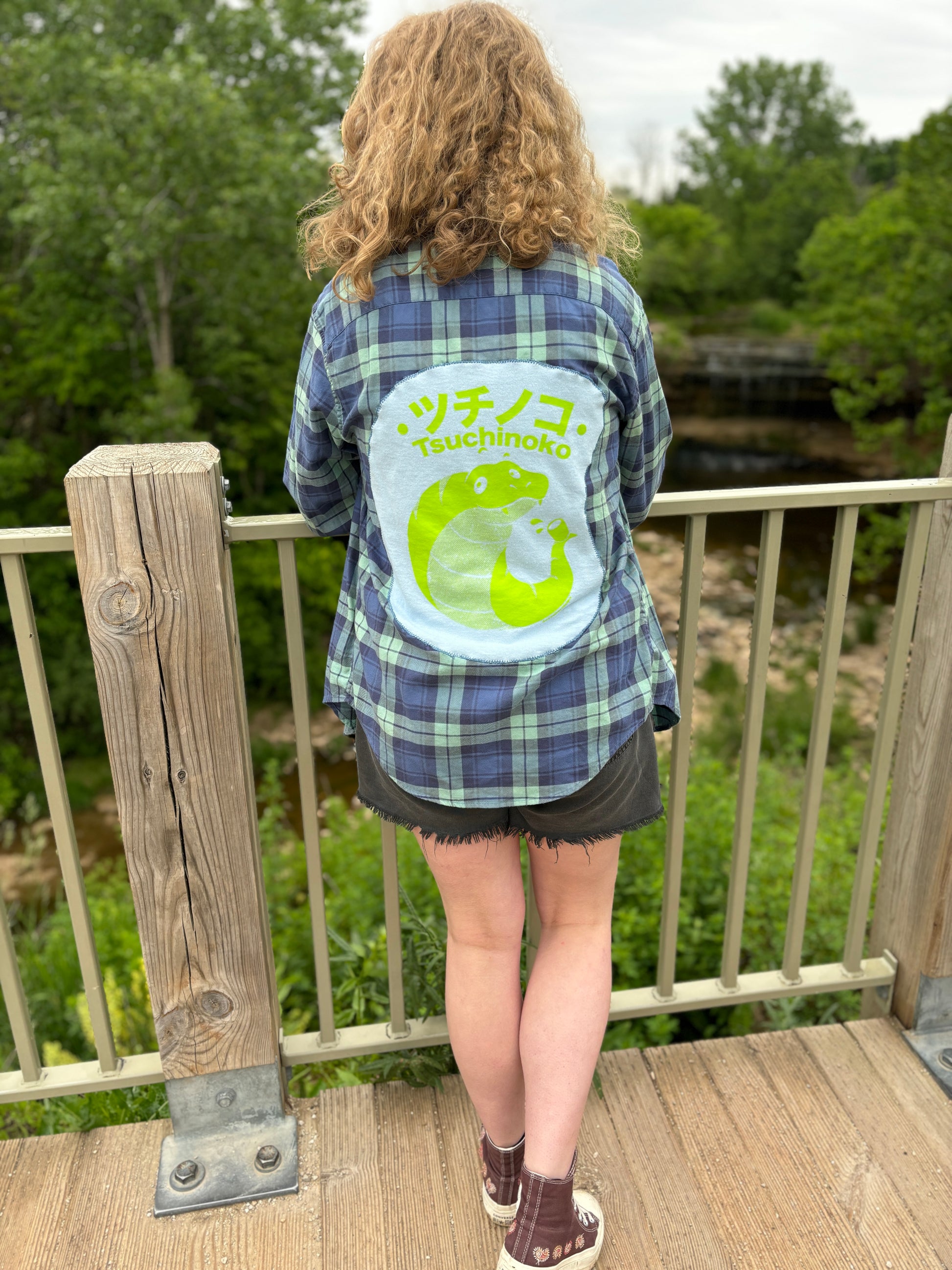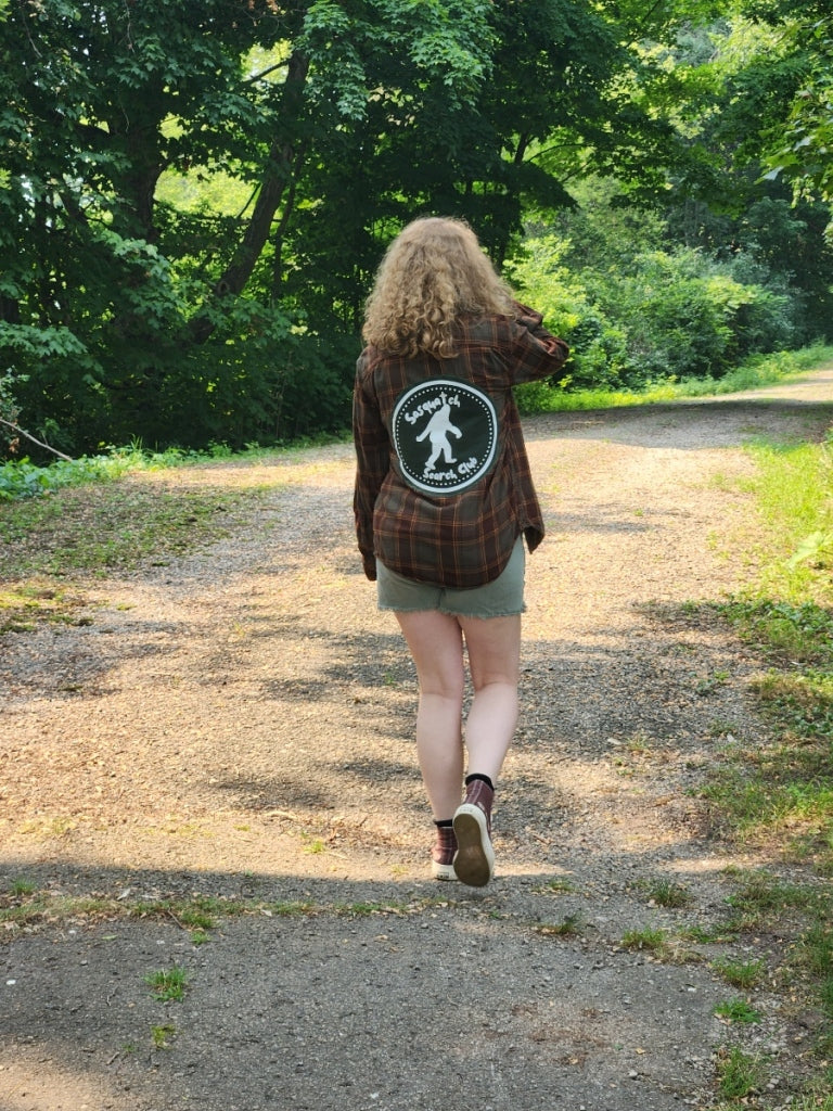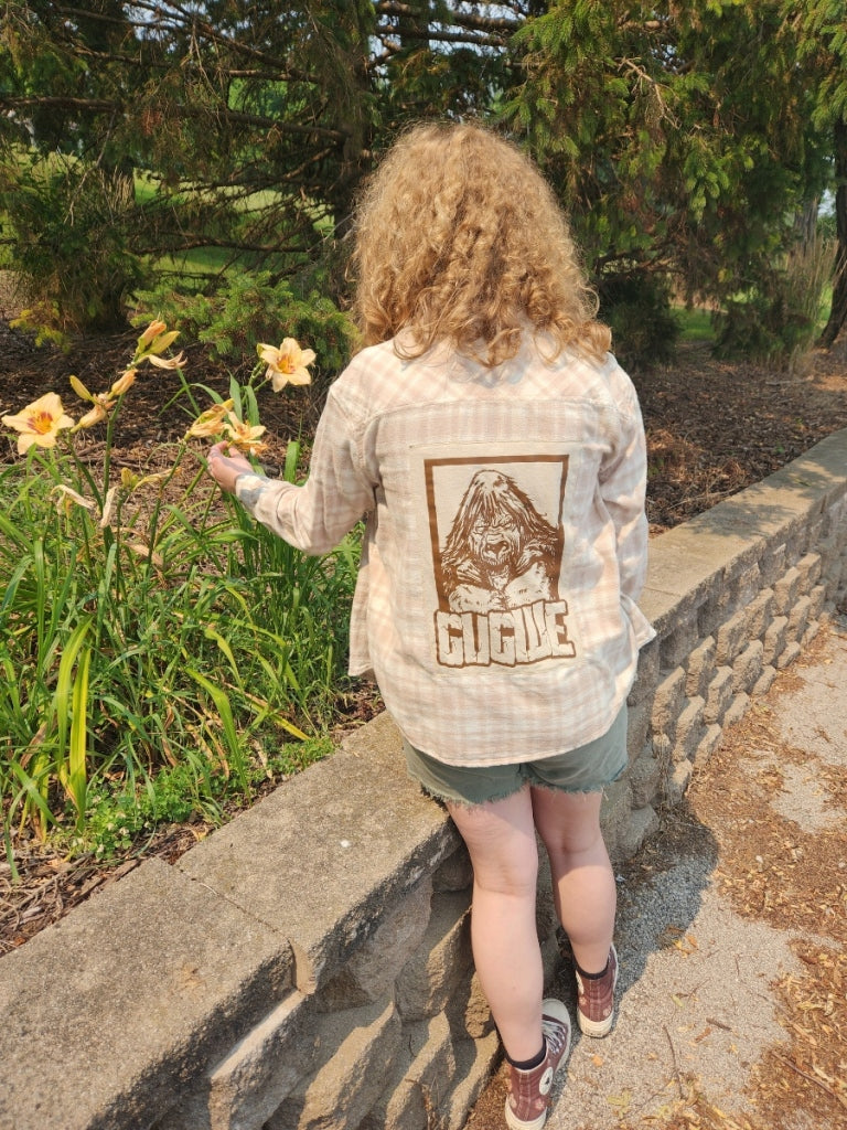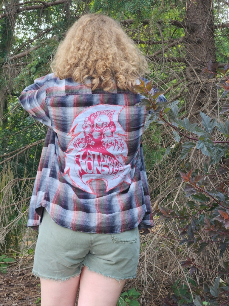 Each of these plaid flannel shirts feature a different t-shirt graphic from a past Cryptid Crate on the back, sewn by Sarah from Frankie’s Pretty Monsters. All of the base flannel shirts were sourced from thrift stores and altered to give them a second life and reduce textile waste. The stitching on the back was done on a sewing machine, and is secure and safe for machine washing. For best results, wash inside-out.