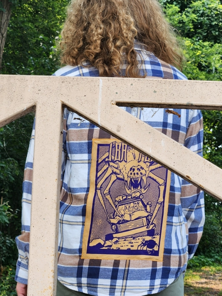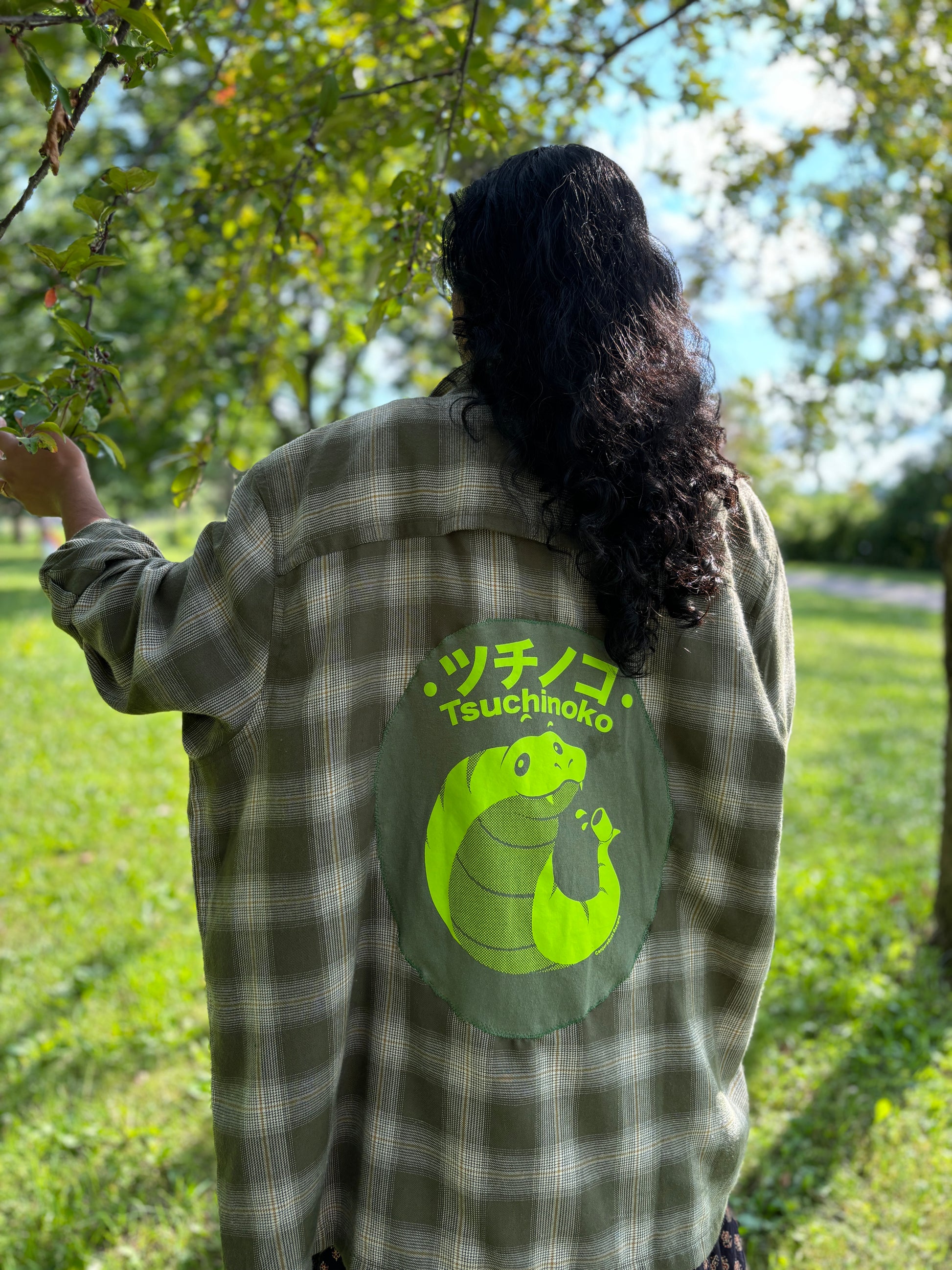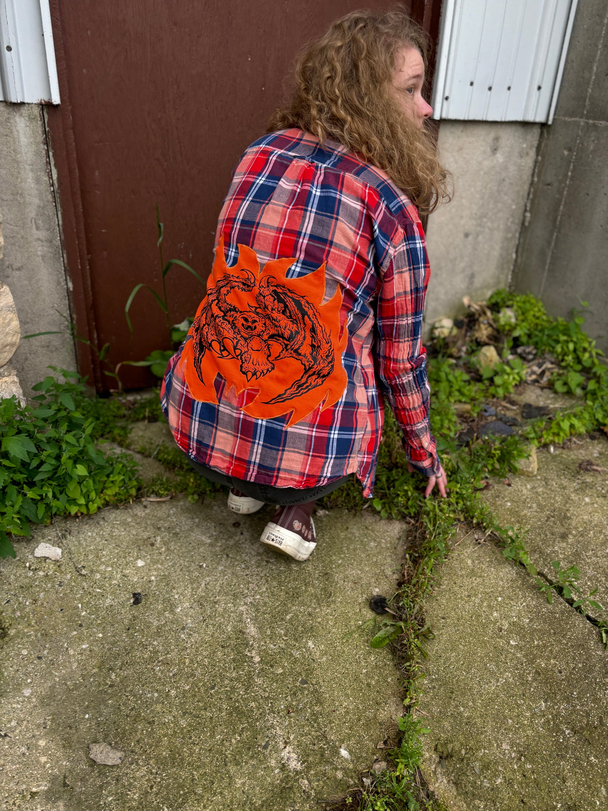 Each of these plaid flannel shirts feature a different t-shirt graphic from a past Cryptid Crate on the back, sewn by Sarah from Frankie’s Pretty Monsters. All of the base flannel shirts were sourced from thrift stores and altered to give them a second life and reduce textile waste. The stitching on the back was done on a sewing machine, and is secure and safe for machine washing. For best results, wash inside-out.