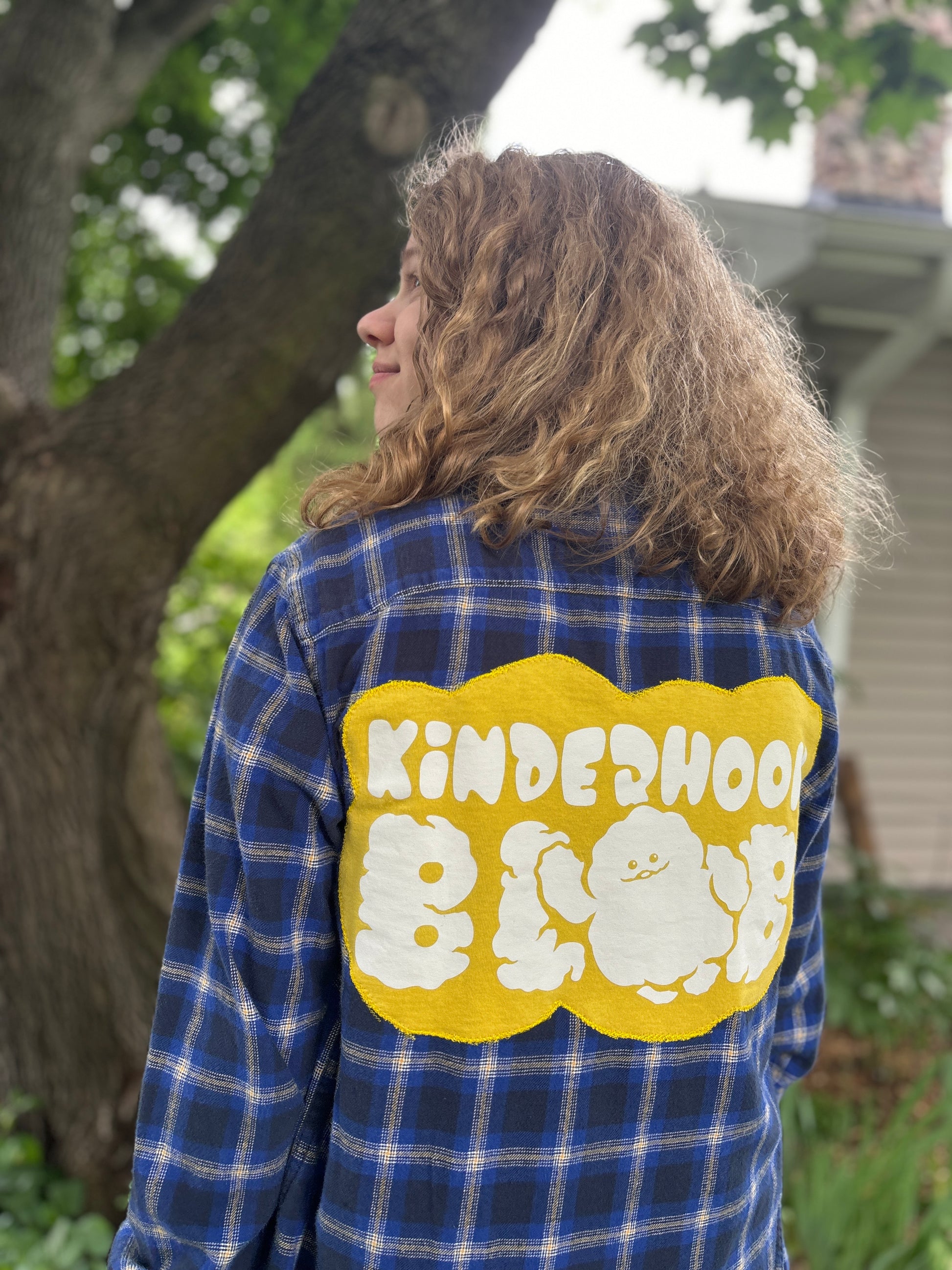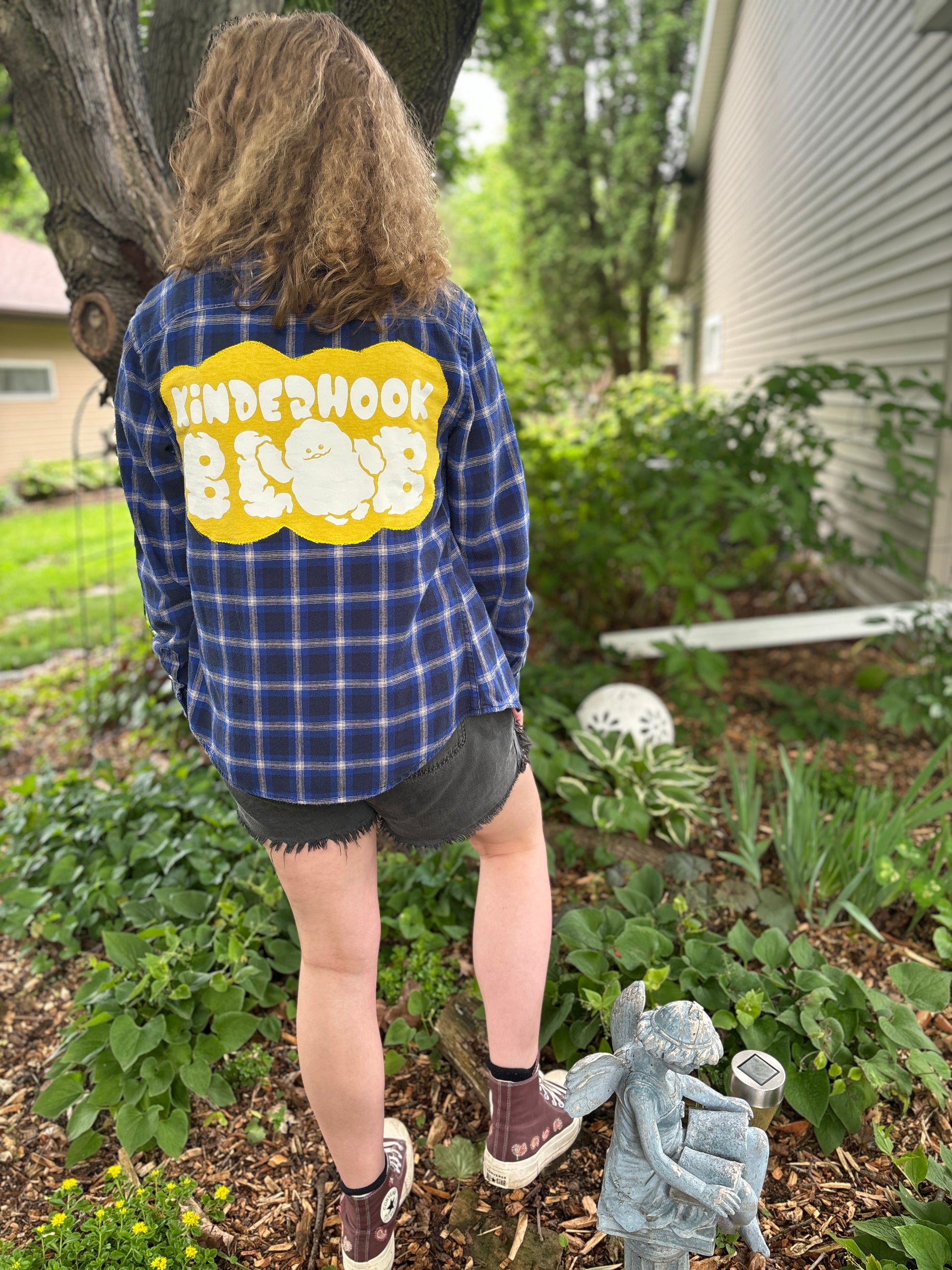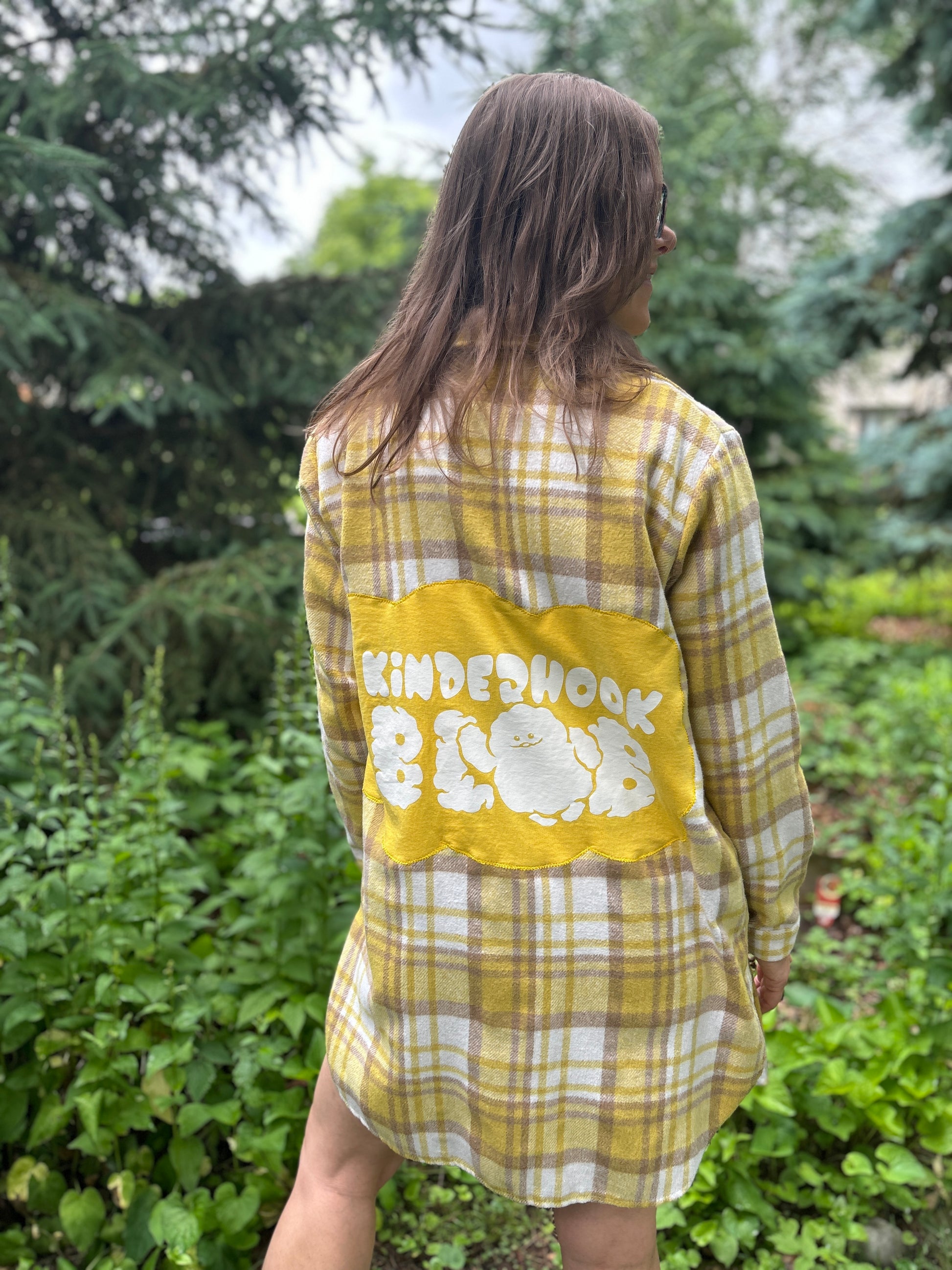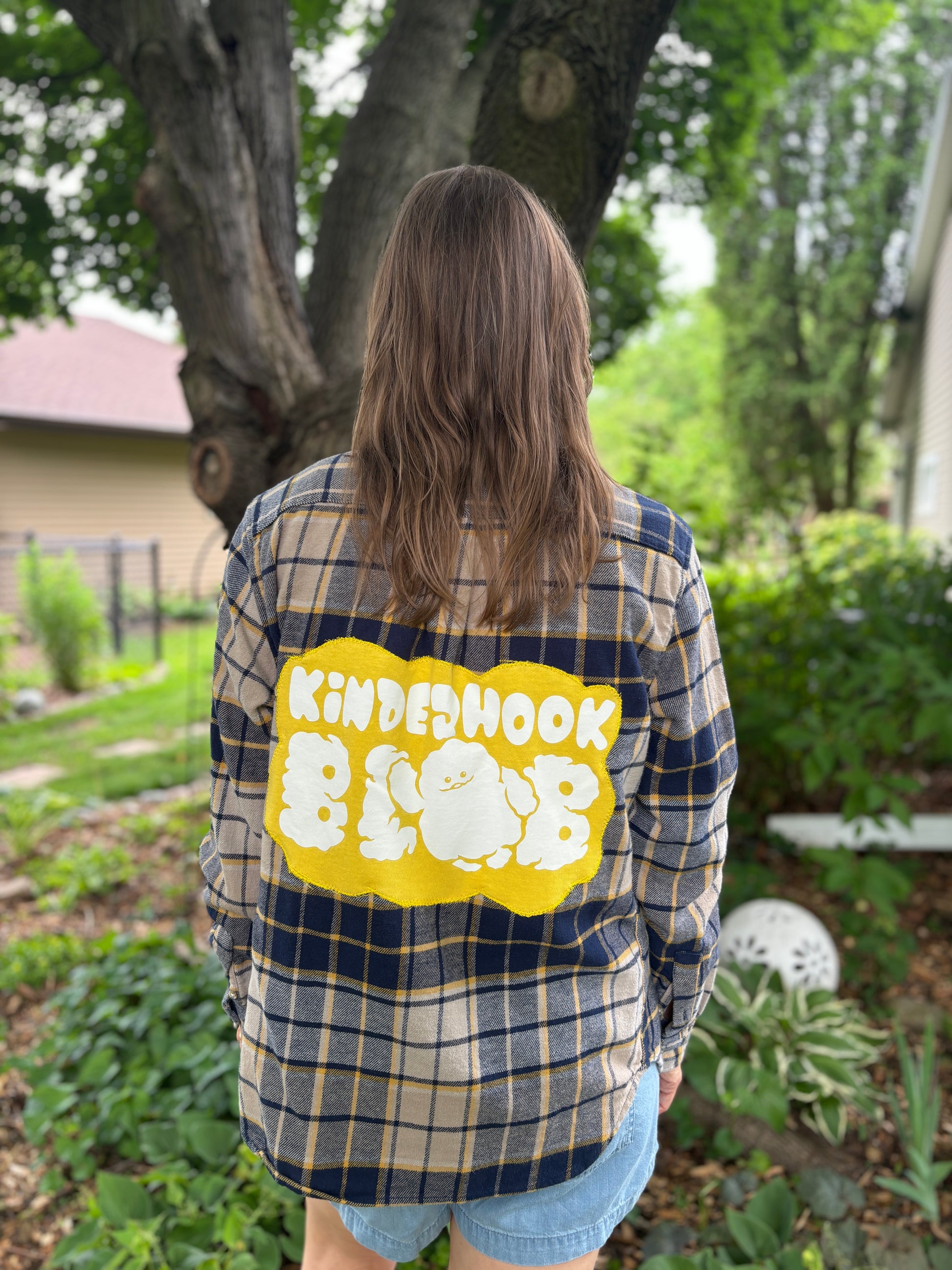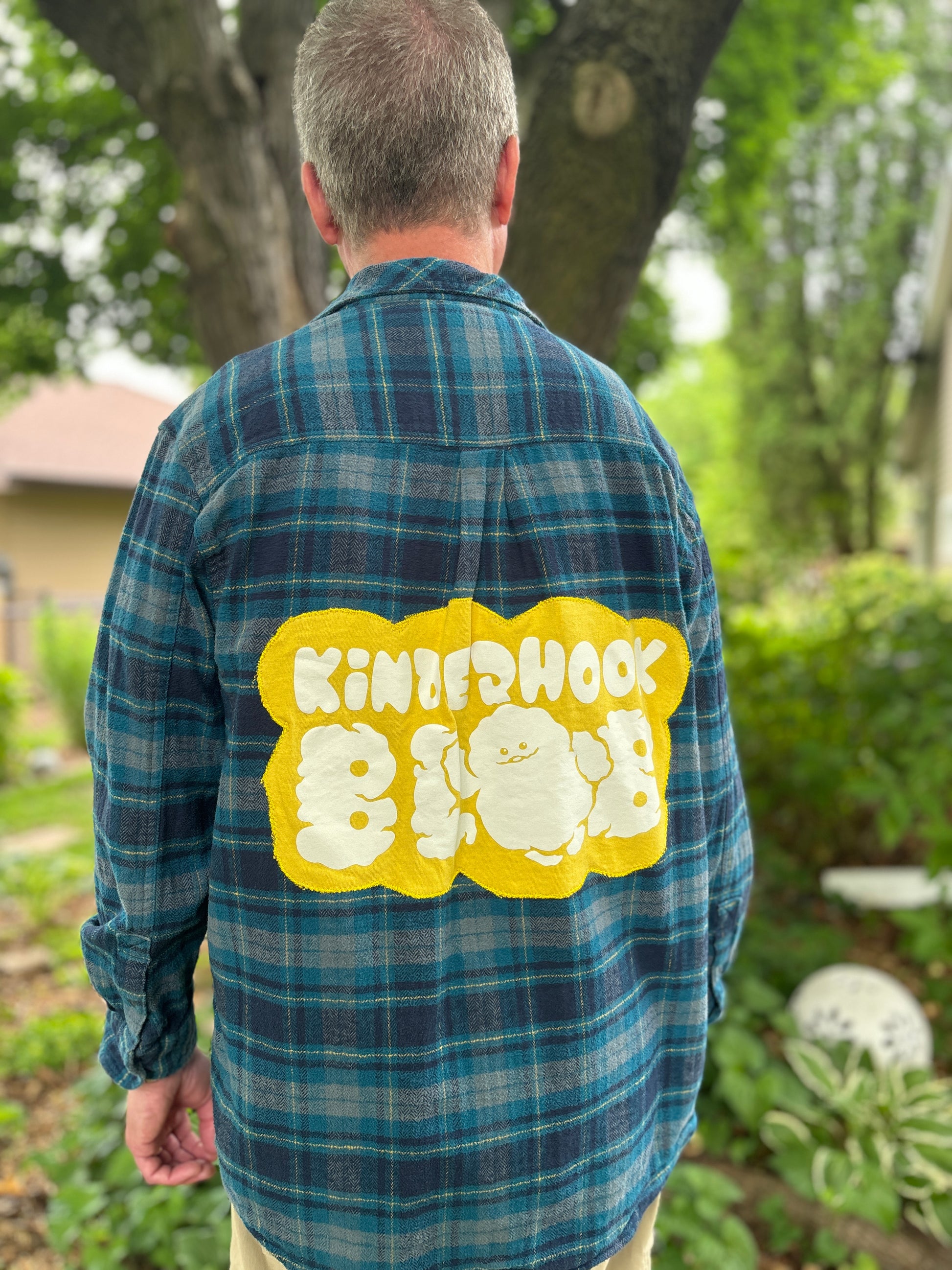The fourth is a dark blue, off-white, and yellow flannel shirt that is labeled as a men’s medium, but the exact measurements are as follows: chest - 23”, length - 25”, shoulder - 6”, sleeve - 24.5”.Van Meter Visitor - t-shirt art by Blair Webb. The base flannel is a women’s medium, but the exact measurements are as follows: chest - 20”, length - 27”, shoulder - 4.5”, sleeve - 24”.