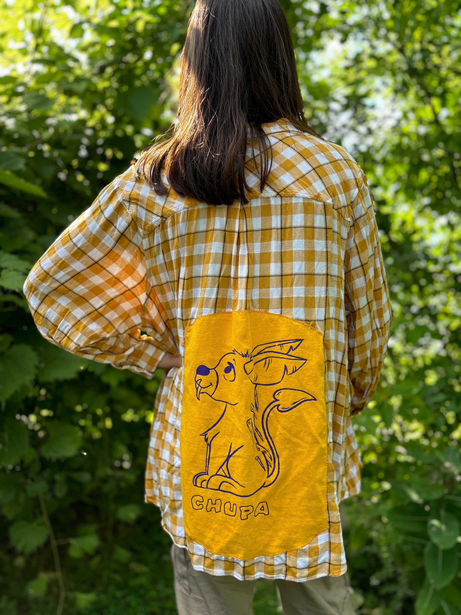 Chupacabra - t-shirt art by Kelly Simcoe. The base flannel is unmarked, but the exact measurements are as follows: chest - 27.5”, length - 27.5”, shoulder - 5”, sleeve - 21.5”.