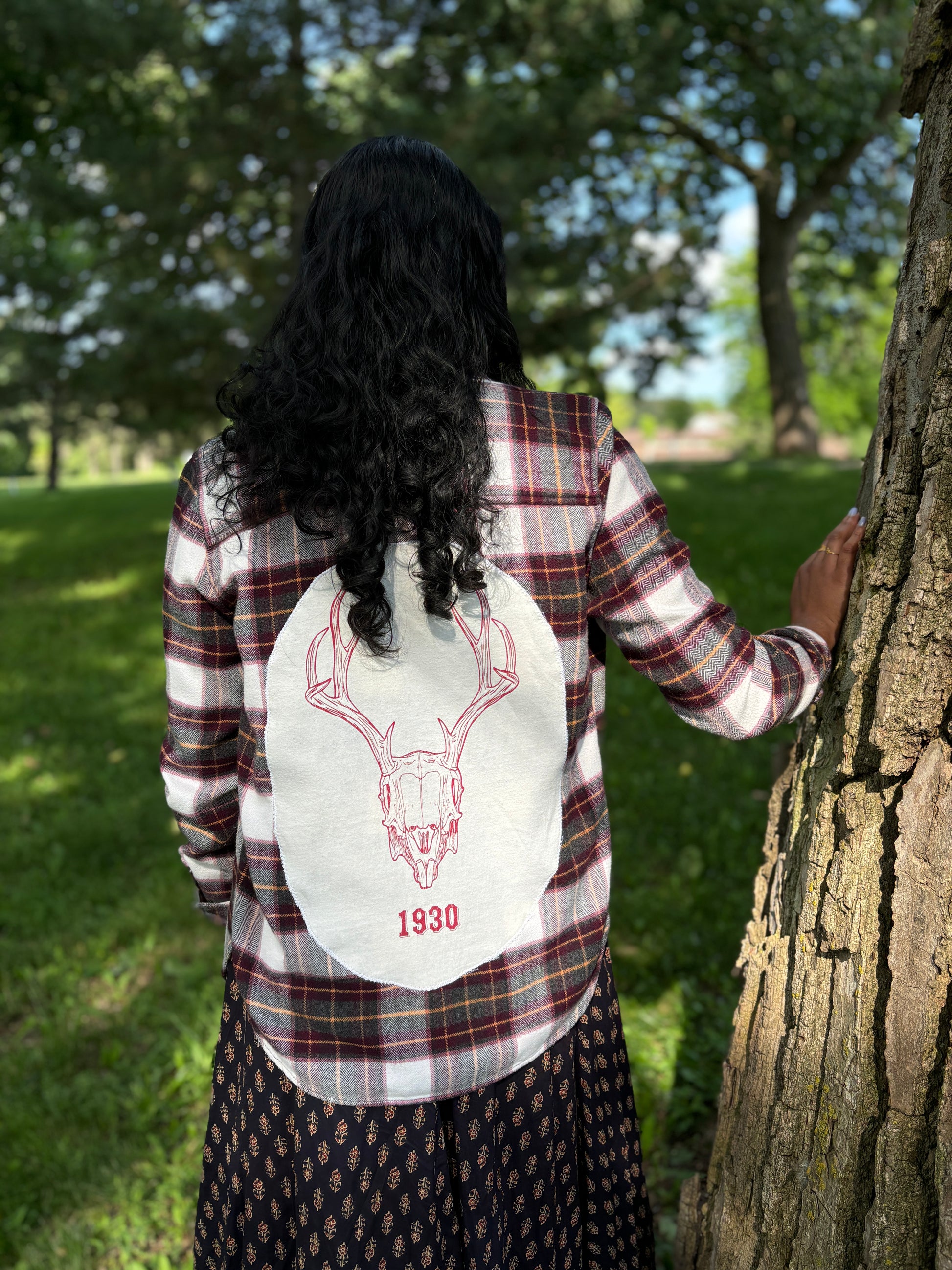 Jackalope - t-shirt art by Cryptid Crate. The base flannel is a women’s medium, but the exact measurements are as follows: chest - 19”, length - 27”, shoulder - 4.5”, sleeve - 24”.