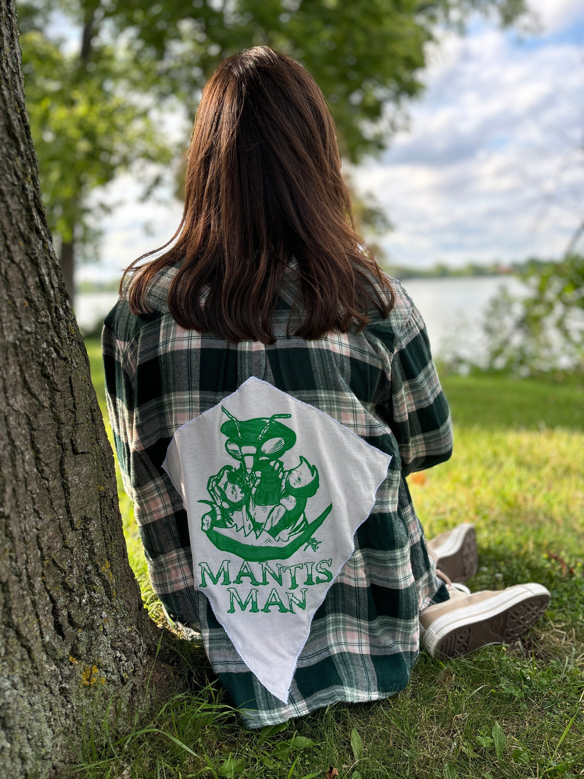 Mantis Man - t-shirt art by Fright Night Sketches. The base flannel is a women’s small, but the exact measurements are as follows: chest - 20”, length - 25”, shoulder - 6”, sleeve - 21”.