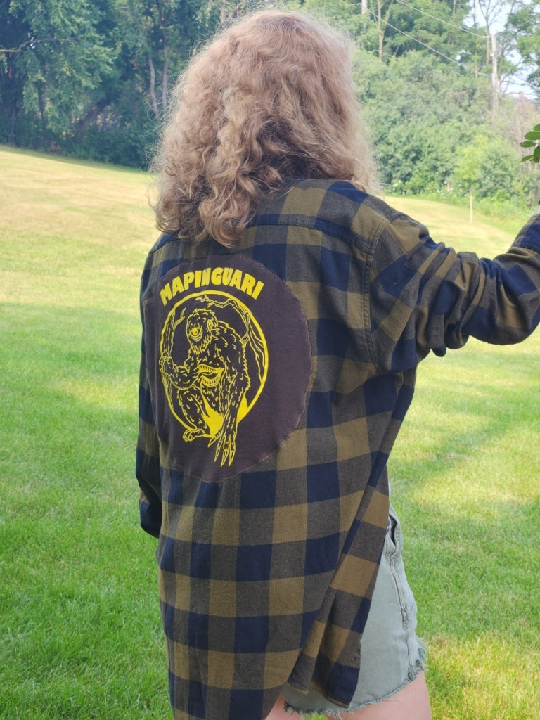 Mapinguari - t-shirt art by Wacky Dragon. The base flannel is a men’s xxlt, but the exact measurements are as follows: chest - 26.5”, length - 34”, shoulder - 7”, sleeve - 29.5”.