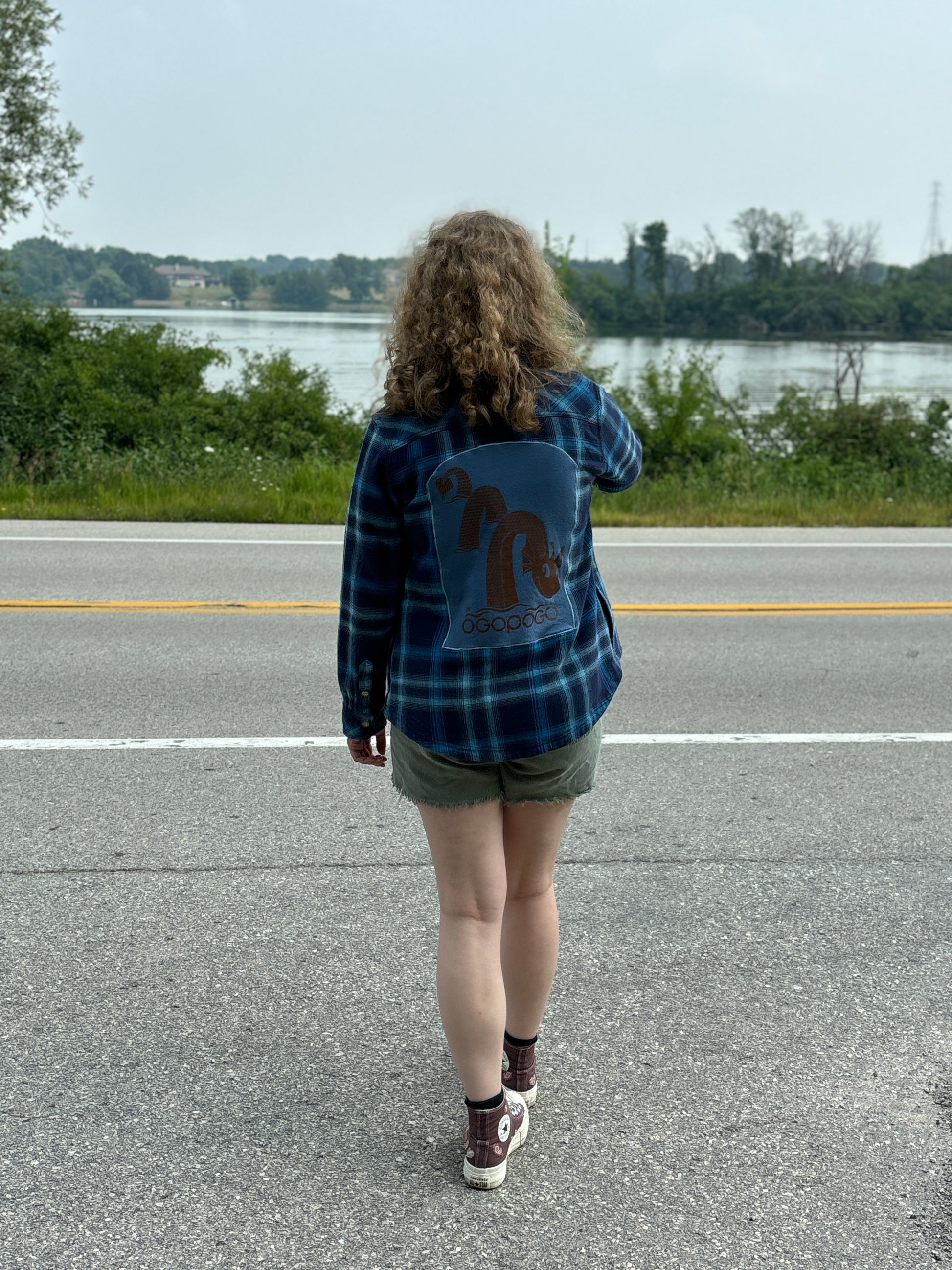 Ogopogo - t-shirt art by Paolo Encarnacion (paoworks). The base flannel is a unisex medium, but the exact measurements are as follows: chest - 20”, length - 26.5”, shoulder - 4”, sleeve - 23”.