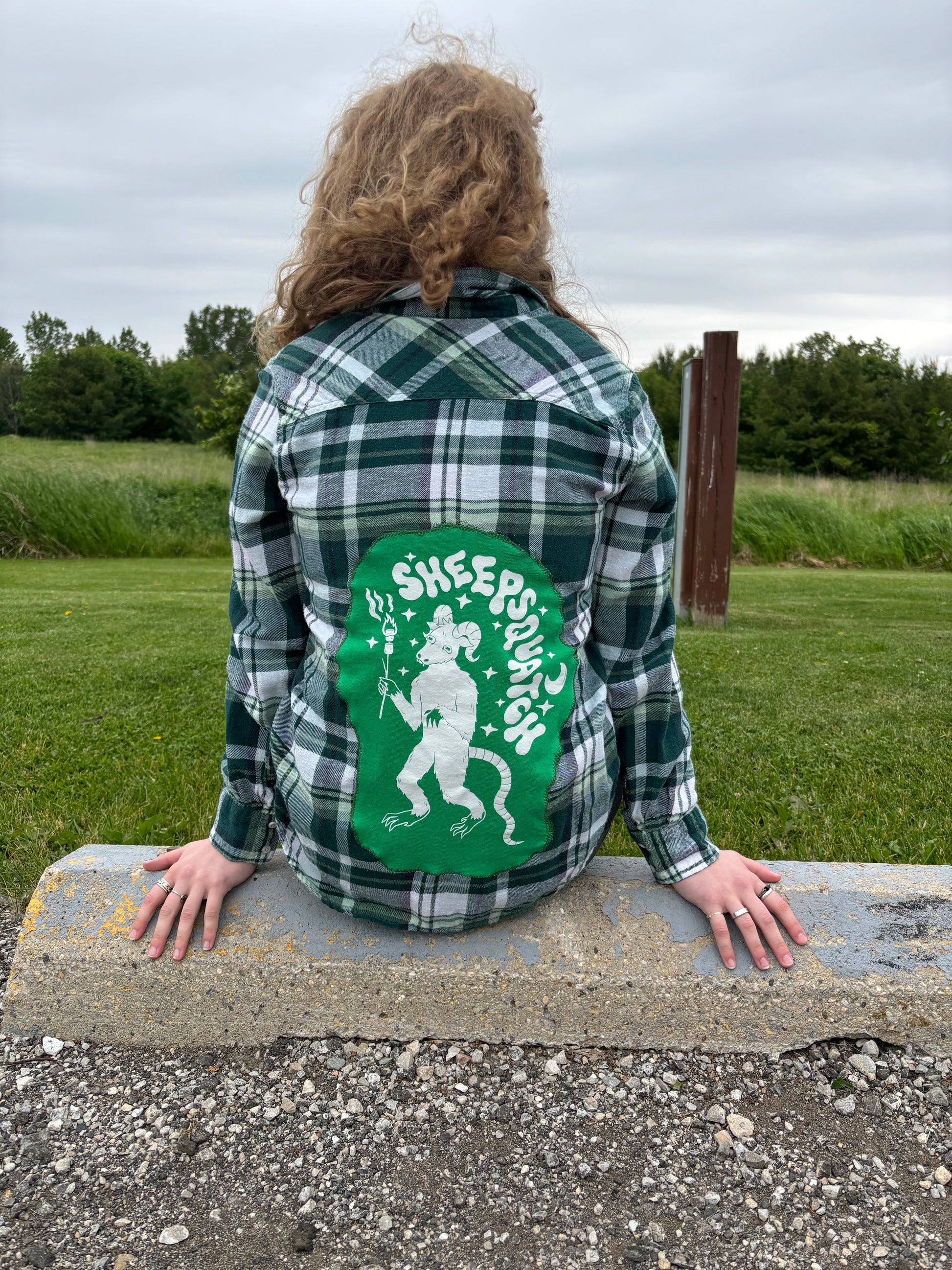 Sheepsquatch - t-shirt art by Liz Pavlovic. The base flannel shirt is a women’s medium, but the exact measurements are as follows: chest - 19”, length - 26.5”, shoulder - 4.5”, sleeve - 23”.