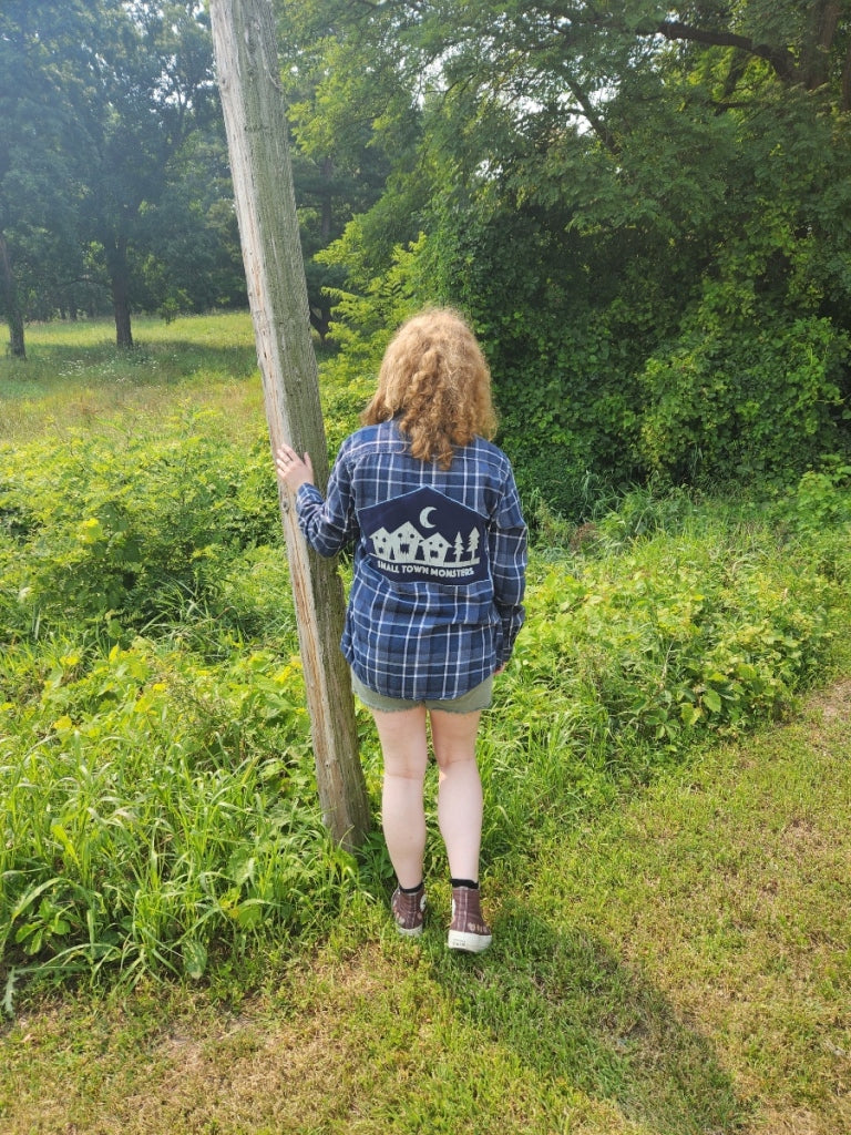 Small Town Monsters - t-shirt art by Small Town Monsters. The base flannel is a unisex medium, but the exact measurements are as follows: chest - 20”, length - 30”, shoulder - 5.5”, sleeve - 25”.