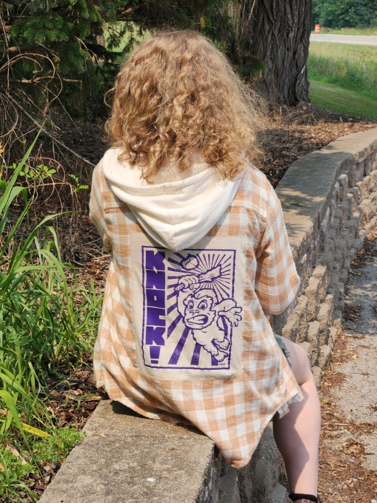 Knock Ape - t-shirt art by Jonathan Dodd. The base flannel is a unisex medium, but the exact measurements are as follows: chest - 22”, length - 29”, shoulder - 3.5”, sleeve - 24”.