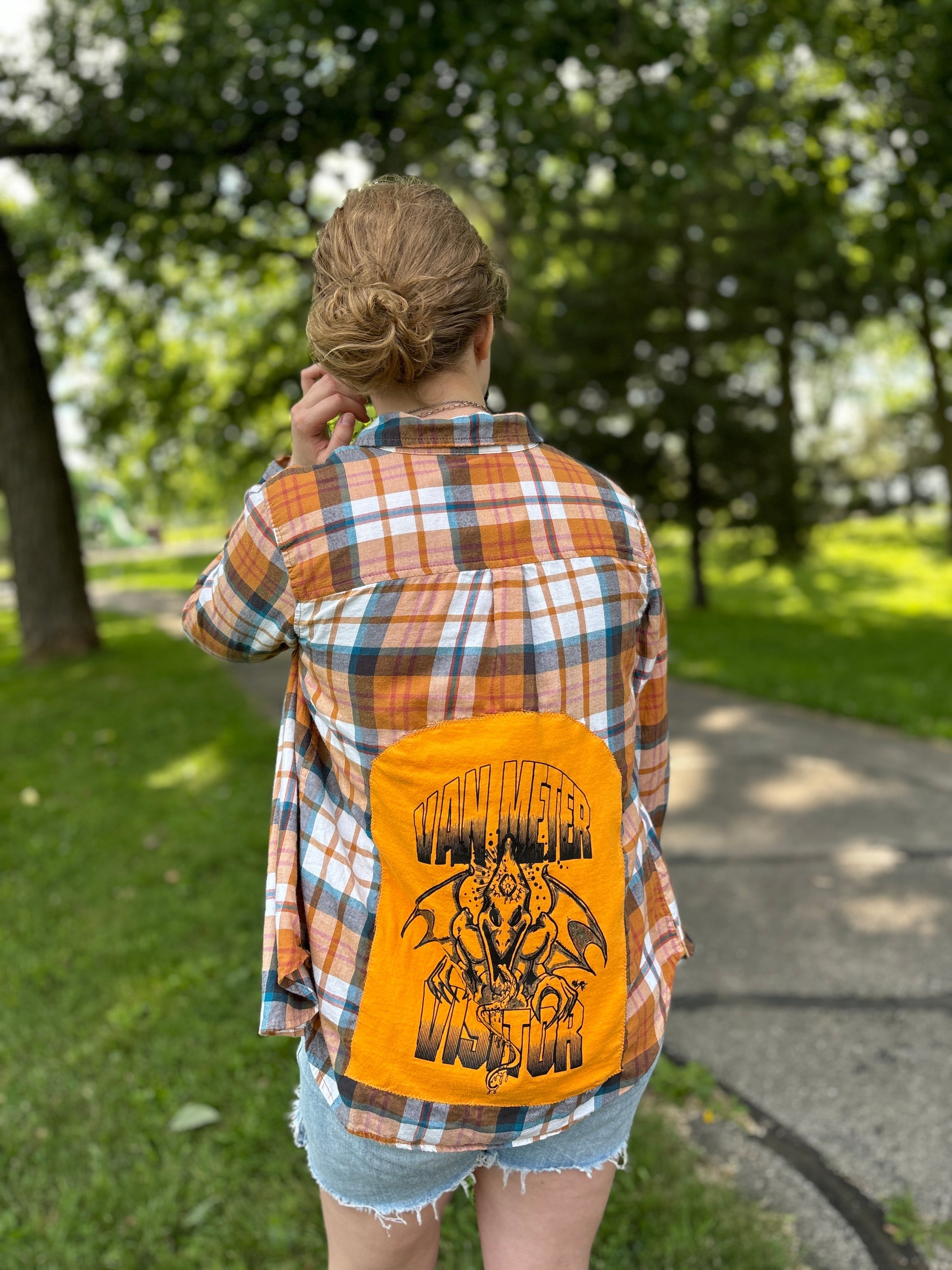 Van Meter Visitor - t-shirt art by Blair Webb. The base flannel is a women’s medium, but the exact measurements are as follows: chest - 20”, length - 27”, shoulder - 4.5”, sleeve - 24”.